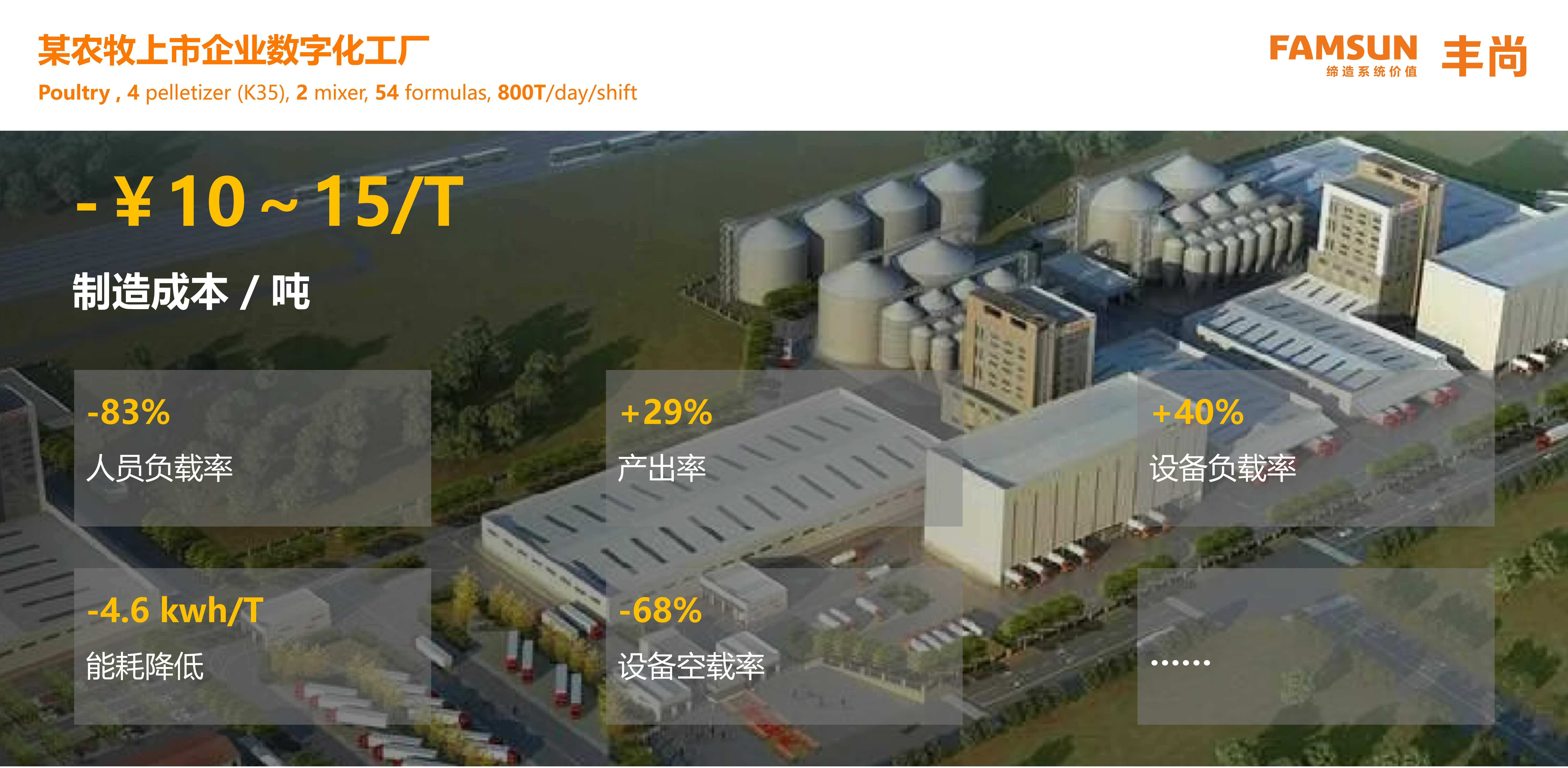在案例分享环节,尹航博士以某上市农牧企业数字化工厂为例,展示了丰尚系统解决方案的实际成效:人员负载率降低83%、吨成本下降10-15元、设备空载率降低68%。