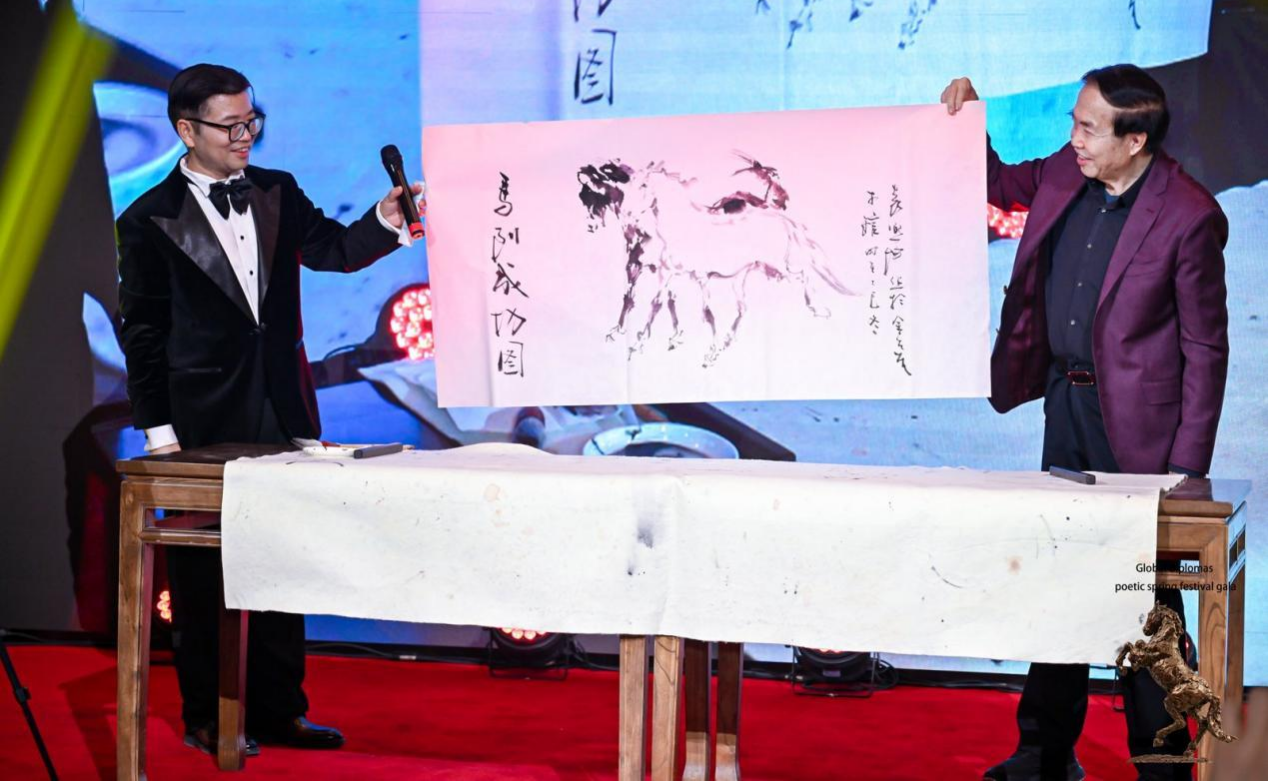 北京金台艺术馆馆长、著名艺术家袁熙坤大师现场泼墨《马到成功双骏图》——以书入画,焦墨写意,琴声悠扬,笔锋游走,一黑一白两匹骏马跃然纸上,栩栩如生,引得满堂喝彩。他以画为媒,为各国使节送上”马到成功“的美好祝福,为丰尚与使节的深度互动铺陈出诗意底色。